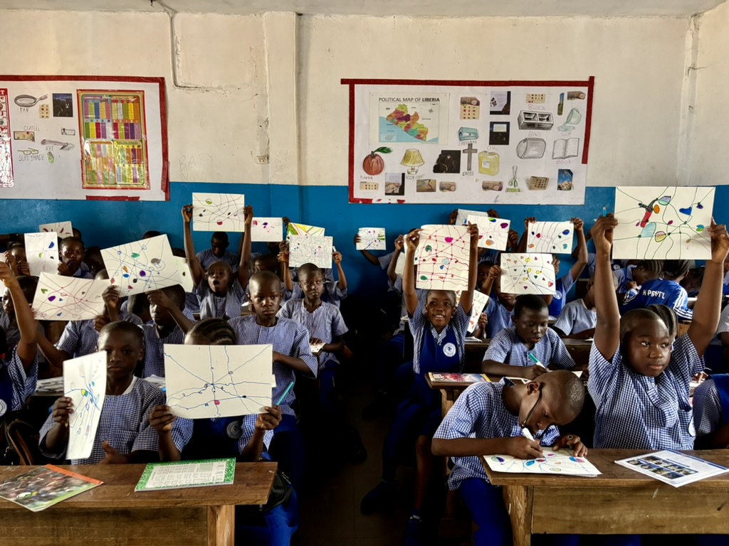 Jackie, Sandi (my travel partners and members of the Hope Project’s board and staff) and I meet Adama, the Dean of Instruction, in his office to gather the supplies. Adama and Desire, the school communications intern, serve as our interpreters for the project. English is the language spoken in Liberia, but the dialect is so unlike American English that I can probably only understand about 20% of what is said. We walk into a 90-degree classroom (with 1000% humidity!) and 60 excited fourth graders. I introduce myself and begin the demonstration.